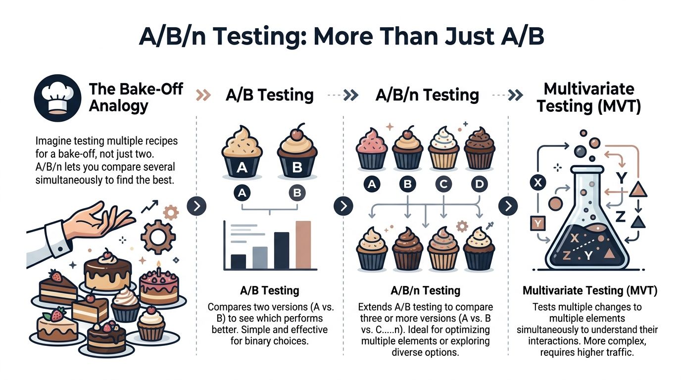If standard A/B testing is a two-recipe bake-off, a b n testing is putting four recipes on the table and letting customer behavior decide which one deserves the menu.