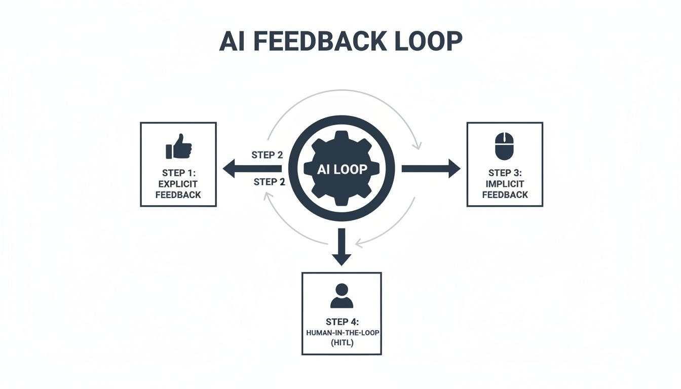 An AI feedback loop, on the other hand, is a living, breathing system. It’s a complete cycle. It doesn't just collect the feedback; it analyzes it, spots the important patterns, and automatically uses those learnings to retrain and improve the AI model.