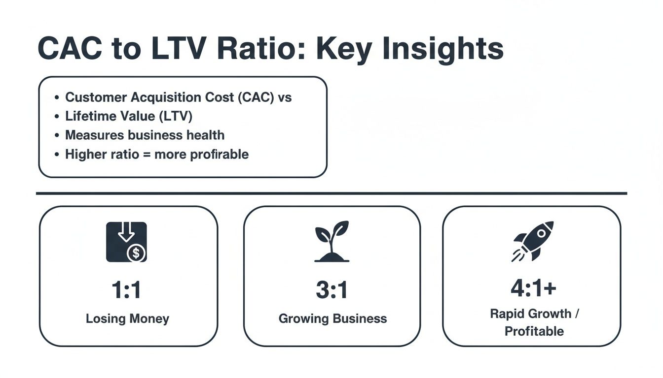 It’s a lot like a car's fuel efficiency. You need to know how many miles you get per gallon to understand the cost of a trip. Similarly, your CAC to LTV ratio tells you exactly how much value you get for every dollar you put into your marketing and sales machine. It’s the clearest way to measure the ROI of your entire go-to-market strategy.