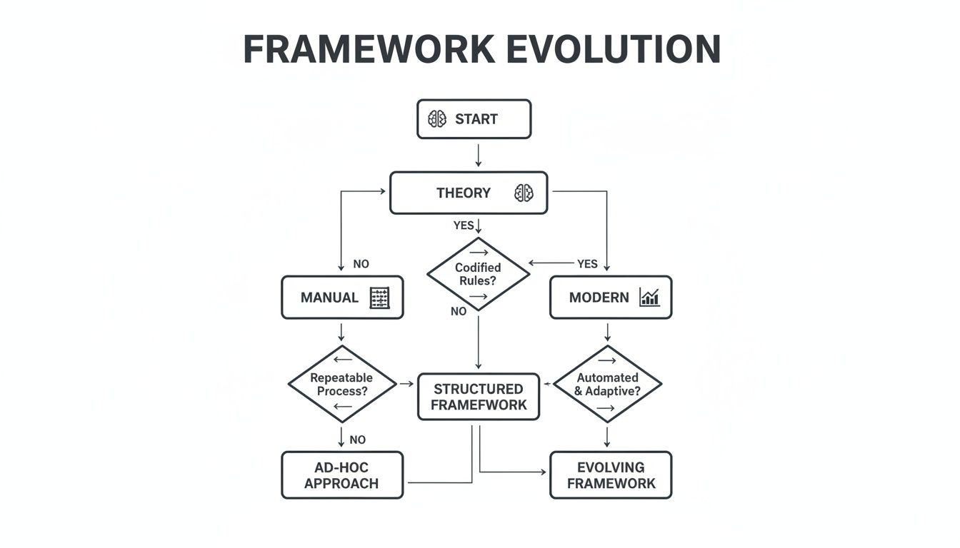 This flowchart shows how these kinds of frameworks have grown from abstract ideas into the sophisticated, data-driven tools we rely on today.