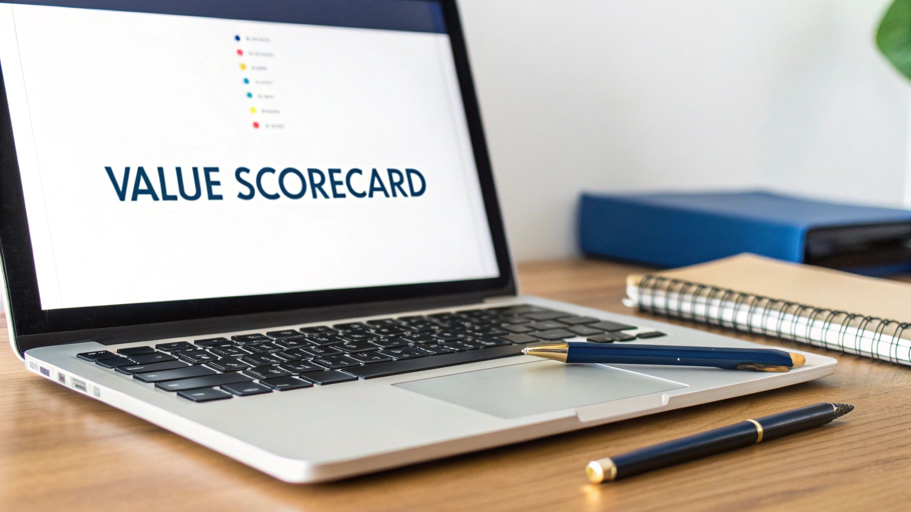 To really get a grip on your product portfolio, you have to get brutally honest about what each product and feature is actually worth. I'm not talking about surface-level metrics like monthly active users. The goal here is to build a "Product Value Scorecard" that ties every single part of your product directly to real, tangible business outcomes.