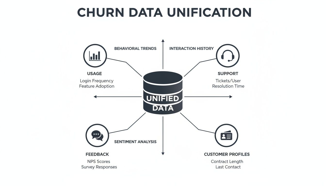 To get a truly predictive model, you need to move beyond simple metrics like login counts. The real magic happens when you bring together different data streams to create a single, unified story for each customer. This is how you spot the subtle, interconnected patterns that show up right before a customer decides to leave.