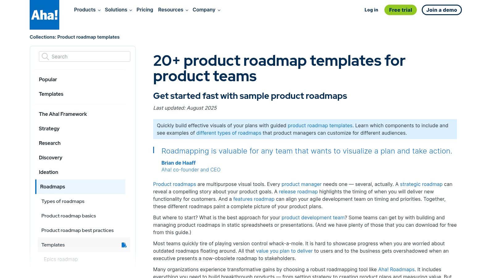 | Aha! – Roadmap and Whiteboard Templates | Polished roadmaps, portfolio and exec templates | ★★★★ — presentation‑grade visuals | 💰 Trial then paid subscription | 👥 Strategy teams, exec communications | 🏆 Professional roadmap storytelling for execs |