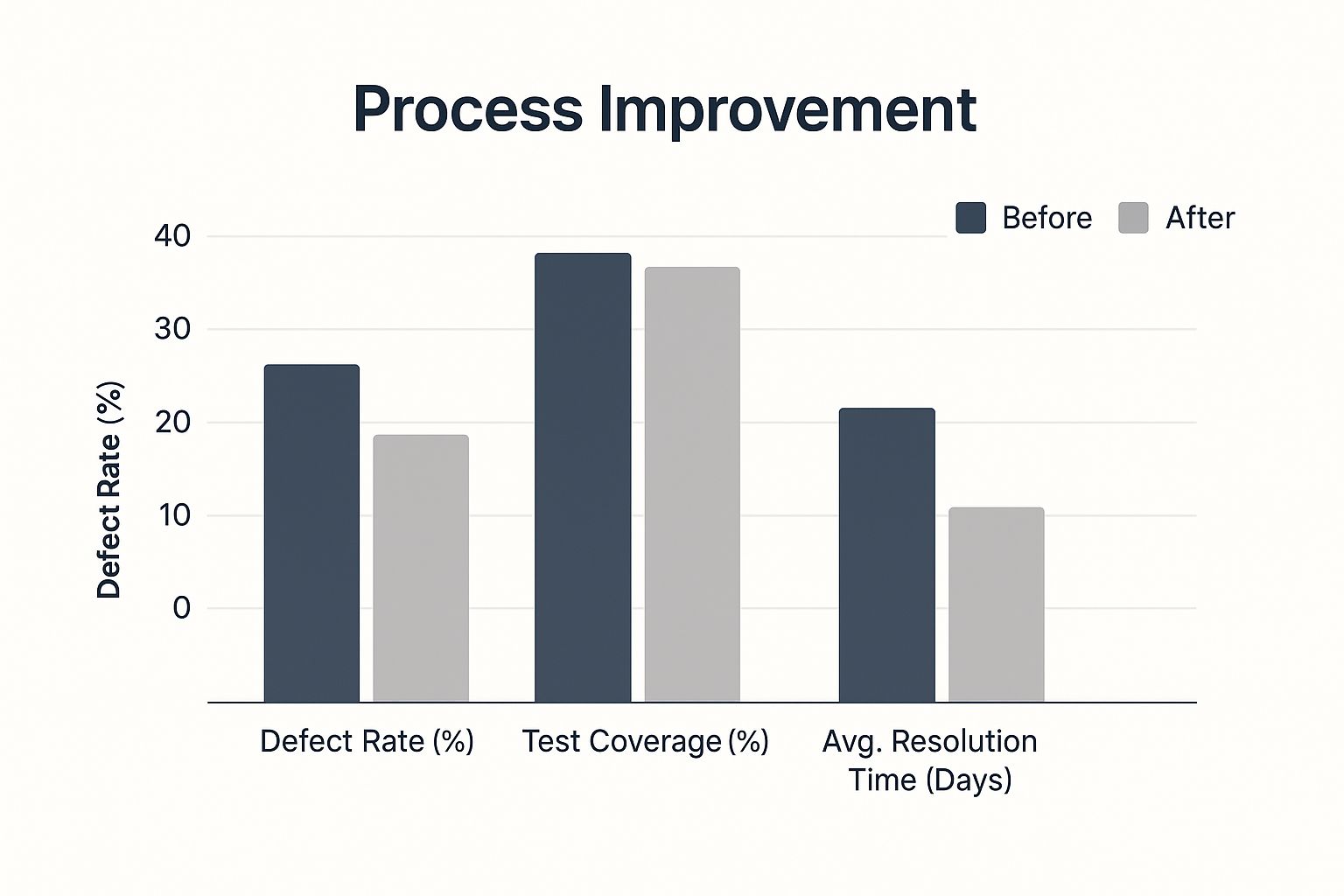 As you can see, a thoughtful investment here leads to a dramatic drop in defect rates and resolution times, all while significantly boosting test coverage.