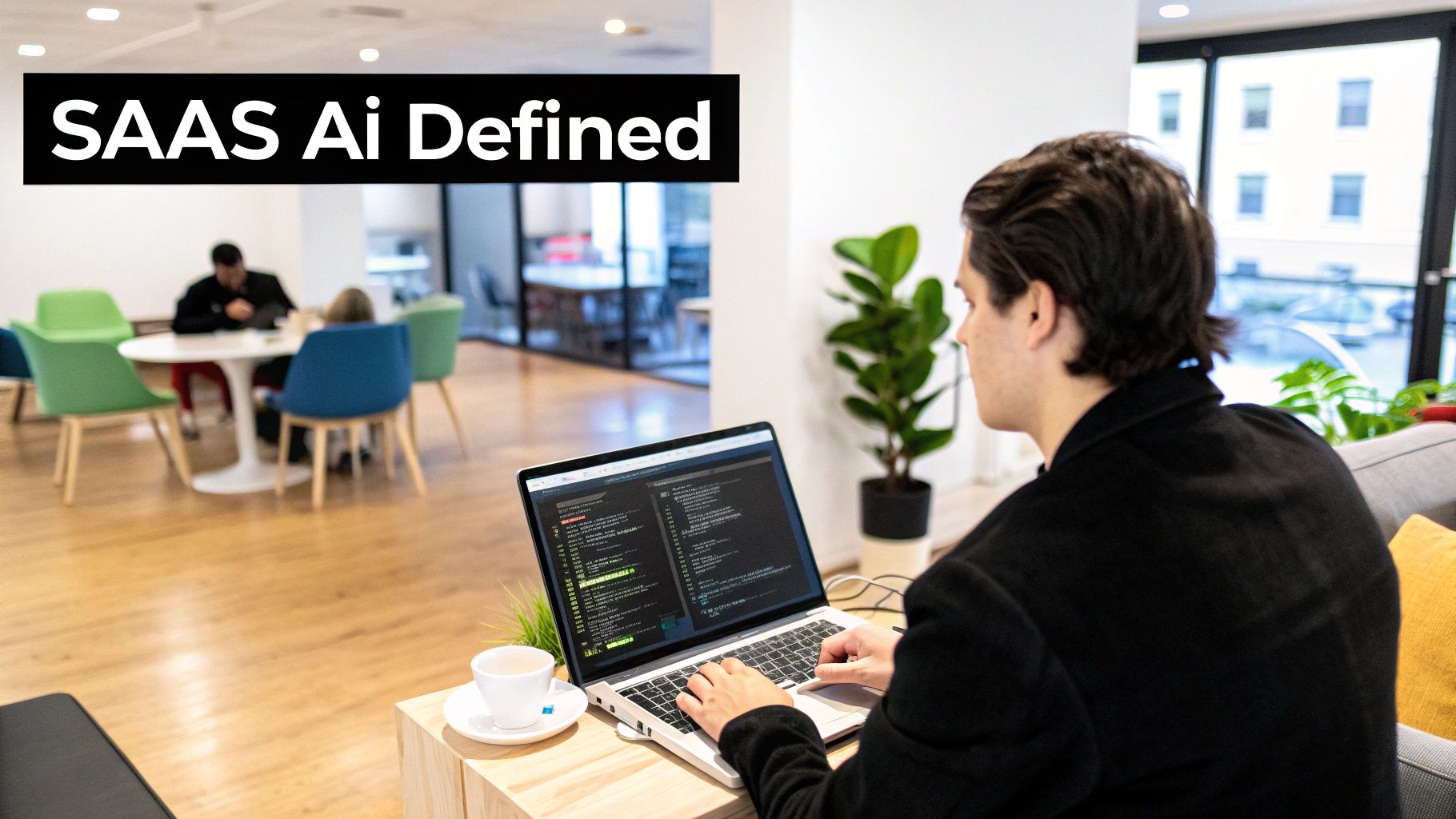 At its heart, SaaS AI is simply about delivering sophisticated AI tools—like machine learning and predictive analytics—through a straightforward, cloud-based subscription. It’s less like buying a massive, complex piece of machinery and more like hiring a team of experts on a monthly retainer. Instead of needing in-house data scientists and a server room full of expensive hardware, companies can tap into powerful intelligence right from the software they use every day.