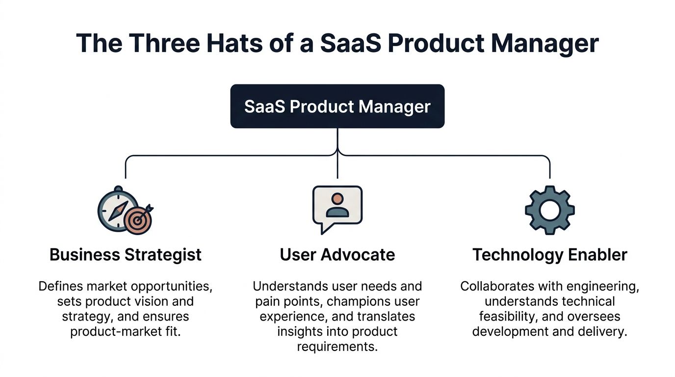 If you want a practical way to understand what a product manager does, use this model: a PM wears three hats at the same time. They act as a business strategist, a user advocate, and a technology enabler.
